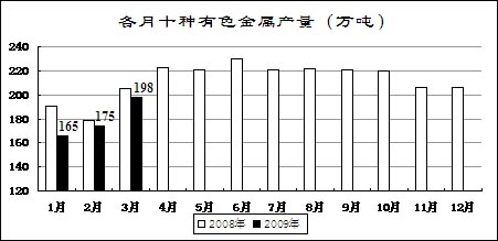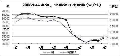 受國家收儲(chǔ)政策、企業(yè)大量停產(chǎn)減產(chǎn)等影響,主要有色金屬價(jià)格有所回升。3月份,國內(nèi)市場銅、電解鋁、鉛、鋅現(xiàn)貨平均價(jià)分別為32543元/噸、13261元/噸、12813元/噸和11735元/噸,比去年12月份回升21.3%、18.9%、22.5%和19.8%,同比下降51%、32.7%、40.9%和43.3%。