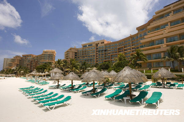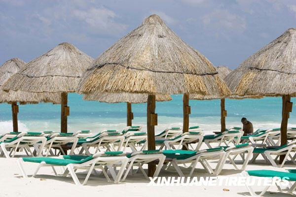 5月12日拍攝的照片顯示墨西哥旅游勝地坎昆海灘上見不到一個游客。甲型H1N1流感使墨西哥旅游業(yè)遭受重創(chuàng)。墨西哥地方官員11日說,游客銳減已迫使旅游勝地坎昆等地的25家酒店關門。墨旅游促進委員會公布最新預測稱,2009年墨西哥旅游業(yè)盈利將比2008年減少近三成。新華社/法新