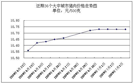 據(jù)國(guó)家發(fā)展改革委價(jià)格監(jiān)測(cè)中心監(jiān)測(cè),上周(2009.6.29-2009.7.3,下同)36個(gè)大中城市集市、超市豬肉(精瘦肉)平均零售價(jià)格每500克為10.73元,與前一周(2009.6.22-2009.6.26,下同)相比上漲1.04%。