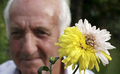威廉安德伍德向記者展示他所種出的黃白雙色菊花。 據(jù)英國媒體8月23日報道,英國薩福克郡一位73歲退休卡車司機威廉安德伍德在自家花園中種出了一株雙色菊花。該菊花為黃白兩色,大小與普通菊花一樣。據(jù)植物學家介紹,出現(xiàn)雙色菊花主要是因為基因突變所致。