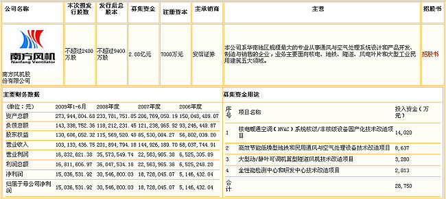 南方風機系華南地區(qū)規(guī)模最大的專業(yè)從事通風與空氣處理系統(tǒng)設(shè)計和產(chǎn)品開發(fā)、制造與銷售的企業(yè),業(yè)務(wù)主要面向核電、地鐵、隧道、風電葉片和大型工業(yè)民用建筑五大領(lǐng)域。 南方風機本次募集資金將用于四大項目的改造,分別是:核電暖通空調(diào)(HVAC)系統(tǒng)核級/非核級設(shè)備國產(chǎn)化技術(shù)改造項目、高效節(jié)能低噪型地鐵和民用通風與空氣處理設(shè)備技術(shù)改造項目、大型動/靜葉可調(diào)機翼型隧道風機技術(shù)改造項目、全性能檢測中心和研發(fā)中心技術(shù)改造項目。 南方風機表示,上述項目共需投入資金28,750萬元。如本次募集資金不能滿足投資項目的資金需求,資金缺口將由公司自籌解決;如所募集資金超過項目資金需求,多余資金將補充公司流動資金。本次募集資金投資項目建成后,南方風機產(chǎn)能將從2008年的26,390件擴大到64,030件,增幅為142.63%。 招股書指出,南方風機07年、08年、09年1-6月的營業(yè)收入分別為1.45億、2.02億和1.03億,凈利潤分別為1873萬、3055萬、1504萬。在過去的3個年度,公司主營業(yè)務(wù)收入、主營業(yè)務(wù)利潤和凈利潤的年增長率平均為76.42%、92.15%和163.51%,體現(xiàn)出了良好的成長性。 在市場占有率方面,截至2009年6月30日,南方風機在國內(nèi)核電站核島HVAC系統(tǒng)設(shè)備的市場占有率為72.44%;在地鐵通風設(shè)備領(lǐng)域的國內(nèi)市場占有率為32.39%,為地鐵通風設(shè)備領(lǐng)域前兩位。 公司控股股東暨實際控制人為楊澤文、楊子善、楊子江,共持有公司本次發(fā)行前總股本的76.19%,他們承諾:自公司股票上市之日起三十六個月內(nèi),不轉(zhuǎn)讓或者委托他人管理其直接或者間接持有的發(fā)行人公開發(fā)行股票前已發(fā)行的股份,也不由發(fā)行人回購該部分股份。 在經(jīng)營風險方面,南方風機指出,公司涉及的風險主要包括主要原材料價格波動風險、控股股東股權(quán)過于集中風險、補交企業(yè)所得稅的風險、客戶工程項目延期的風險、應(yīng)收賬款發(fā)生壞賬的風險、資產(chǎn)規(guī)模迅速擴張帶來的管理風險、凈資產(chǎn)收益率下降的風險等。