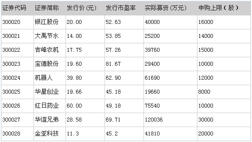 15日,包括銀江股份、大禹節(jié)水、吉峰農(nóng)機在內(nèi)的9只創(chuàng)業(yè)板新股將在網(wǎng)上發(fā)行,相比前兩批,這批公司的發(fā)行市盈率相對較高。據(jù)悉,業(yè)內(nèi)人士普遍看好華誼兄弟、紅日藥業(yè)、機器人三家企業(yè)。另外,投資者如果要全部頂格申購9家企業(yè),所需資金將高達(dá)330萬元。