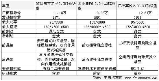 從表中對(duì)比我們看出,動(dòng)力性能F6最強(qiáng),最大功率103千瓦,最大扭矩186牛米。剩余兩款車最大功率完全一致,最大扭矩依次為東方之子182牛米,賓悅172牛米,均集中在4500轉(zhuǎn)為最大值。前后制動(dòng)都是采用盤式,驅(qū)動(dòng)形式也都采用了前驅(qū)驅(qū)動(dòng)。
