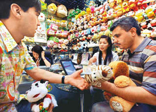 | 土耳其采購商在浙江義烏挑選訂購毛絨玩具。新華社記者 譚進(jìn)
