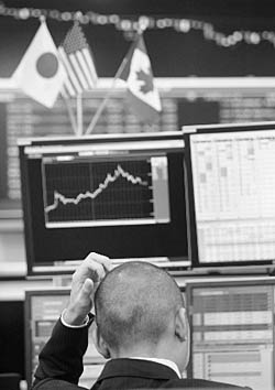 | 29日,一名交易員在日本東京一家外匯交易所內(nèi)工作