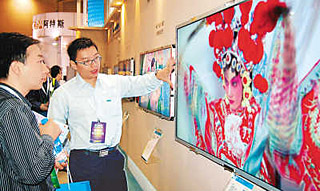 | 在2008中國蘇州電子信息博覽會(huì)上,一名工作人員向參觀者介紹超薄新款電視機(jī)。朱桂根