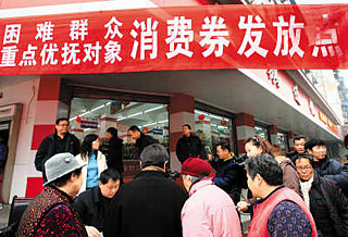 | 成都金牛區(qū)撫琴社區(qū)的部分困難群眾正在領(lǐng)取成都市發(fā)放的消費(fèi)券。CFP供圖 | 價值3791萬元的消費(fèi)券,發(fā)放給30余萬困難群眾,能否達(dá)到刺激消費(fèi)、擴(kuò)大內(nèi)需的政策效果?成都市發(fā)放消費(fèi)券的措施,近日引起了社會廣泛關(guān)注。