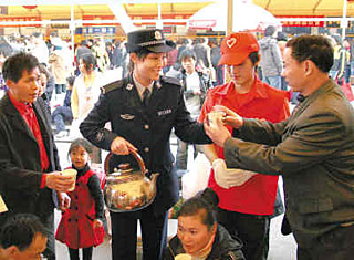 | 一月十四日,廈門鐵路民警在廈門火車站為購(gòu)票、候車的旅客提供茶水。新華社記者 項(xiàng)開(kāi)來(lái)
