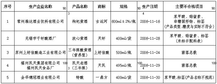 黃酒部分質(zhì)量較差產(chǎn)品及其企業(yè)名單