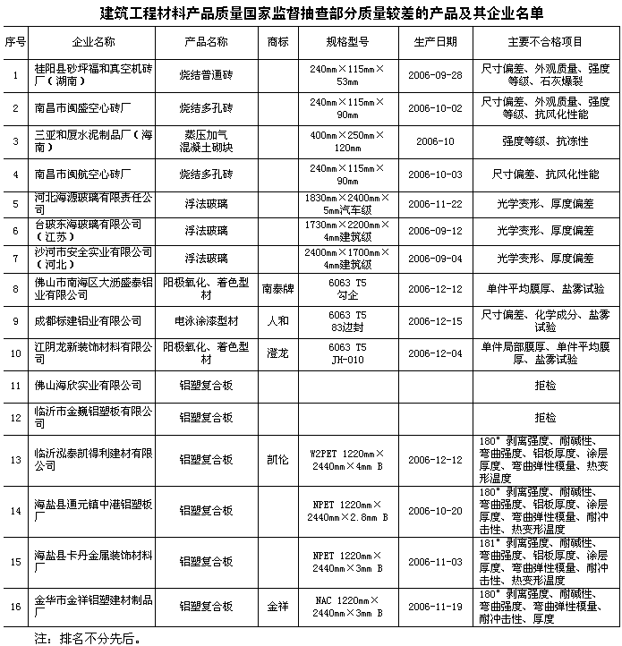 鋁塑復(fù)合板:產(chǎn)品抽樣合格率為69.4%。主要問題:部分產(chǎn)品180°剝離強(qiáng)度、耐堿性、彎曲強(qiáng)度、厚度不合格。另外,佛山海欣實(shí)業(yè)有限公司和臨沂市金巍鋁塑板有限公司在國(guó)家監(jiān)督抽查中拒檢,其產(chǎn)品質(zhì)量按不合格論處。