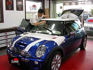 專(zhuān)家建議為汽車(chē)安裝貼膜最好到專(zhuān)業(yè)店。 圖為在北京一家“龍膜”授權(quán)施工連鎖店,“龍膜”技師正在為汽車(chē)安裝前擋膜。Lois