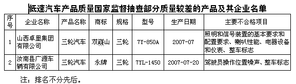 日前,國(guó)家質(zhì)檢總局對(duì)低速汽車(chē)產(chǎn)品質(zhì)量進(jìn)行了國(guó)家監(jiān)督抽查,共抽查了河北、山西、江蘇、浙江、江西、福建、山東、河南、四川、安徽、廣西等11個(gè)省、自治區(qū)28家企業(yè)生產(chǎn)的28種產(chǎn)品(不涉及出口產(chǎn)品),產(chǎn)品實(shí)物質(zhì)量合格率為92.9%。 依據(jù)相關(guān)的國(guó)家強(qiáng)制性標(biāo)準(zhǔn)及推薦性標(biāo)準(zhǔn),此次抽查對(duì)低速汽車(chē)的行車(chē)制動(dòng)性能(滿載)、駐車(chē)制動(dòng)性能、燃料系統(tǒng)及排氣管、安全防護(hù)要求、自卸裝置、轉(zhuǎn)向及限位裝置、滿載最高車(chē)速、車(chē)輛外廓尺寸、車(chē)輛后懸、使用說(shuō)明書(shū)等21個(gè)項(xiàng)目進(jìn)行了檢驗(yàn)。 抽查結(jié)果表明,連續(xù)多年的國(guó)家監(jiān)督抽查促進(jìn)了企業(yè)質(zhì)量意識(shí)的提高,產(chǎn)品質(zhì)量保持穩(wěn)定;此外,市場(chǎng)占有率較高的大、中型企業(yè)的產(chǎn)品質(zhì)量較好。 抽查中發(fā)現(xiàn)的主要質(zhì)量問(wèn)題是整車(chē)標(biāo)志、圖形和文字標(biāo)志不符合標(biāo)準(zhǔn)規(guī)定。國(guó)家強(qiáng)制性標(biāo)準(zhǔn)規(guī)定,低速汽車(chē)產(chǎn)品標(biāo)牌內(nèi)容應(yīng)規(guī)范齊全,車(chē)輛識(shí)別代碼、發(fā)動(dòng)機(jī)編號(hào)打刻位置應(yīng)在說(shuō)明書(shū)中指明,三輪汽車(chē)的變速桿、手柄和開(kāi)關(guān)等操縱機(jī)構(gòu)應(yīng)有耐久性標(biāo)志明確標(biāo)明其功能等。抽查中有個(gè)別產(chǎn)品標(biāo)牌內(nèi)容不全,車(chē)輛識(shí)別代碼、發(fā)動(dòng)機(jī)編號(hào)位置與說(shuō)明書(shū)指明位置不符,燈具開(kāi)關(guān)無(wú)圖形和文字標(biāo)志等。