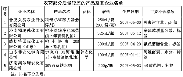 為維護廣大農(nóng)民消費者的合法權(quán)益,促進(jìn)農(nóng)藥行業(yè)健康發(fā)展,國家質(zhì)檢總局組織對農(nóng)藥產(chǎn)品質(zhì)量進(jìn)行了國家監(jiān)督抽查。共抽查了江蘇、浙江、安徽、山東等四個省65家企業(yè)生產(chǎn)的80種產(chǎn)品(不涉及出口產(chǎn)品),產(chǎn)品實物質(zhì)量合格率為90%。 此次抽查依據(jù)GB9552-1999《百菌清可濕性粉劑》等強制性國家標(biāo)準(zhǔn)及相關(guān)產(chǎn)品標(biāo)準(zhǔn)規(guī)定的要求,對農(nóng)藥產(chǎn)品的有效成分含量、懸浮率、乳液穩(wěn)定性、稀釋穩(wěn)定性、細(xì)度、水分、pH值以及標(biāo)簽等八個項目進(jìn)行了檢驗。 抽查中發(fā)現(xiàn)的主要質(zhì)量問題:個別產(chǎn)品有效成分不符合標(biāo)準(zhǔn)要求。其中有一種產(chǎn)品有效成分氰戊菊酯含量應(yīng)為5.0%,實測氰戊菊酯含量為零;有一種產(chǎn)品有效成分辛硫磷含量應(yīng)為15.0%,實測結(jié)果不含辛硫磷成分。使用有效成分含量不足的農(nóng)藥,起不到預(yù)期的防治效果,直接影響農(nóng)作物的生長;個別產(chǎn)品pH值不合格、水分含量超標(biāo)。其中有一種產(chǎn)品標(biāo)準(zhǔn)規(guī)定pH值范圍為4.0至7.0,實測pH值為1.5;有一種產(chǎn)品水分含量標(biāo)準(zhǔn)規(guī)定≤0.5%,實測水分含量為4.3%。pH值、水分含量不合格會導(dǎo)致農(nóng)藥產(chǎn)品質(zhì)量不穩(wěn)定,達(dá)不到產(chǎn)品的預(yù)期藥效;部分產(chǎn)品標(biāo)簽標(biāo)注不規(guī)范。抽查中有部分產(chǎn)品未標(biāo)明有效成分含量、許可證產(chǎn)品未按規(guī)定標(biāo)注QS標(biāo)志等。