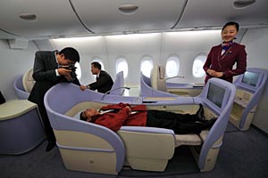 在飛機成為人們主要旅行交通工具的現(xiàn)代社會,因各種原因成為“空中飛人”的人可能都有這樣的感受:在飛機上長途旅行太辛苦。擁擠的座位讓你即使蜷縮著也無法入睡,而鄰座與別人閑談就像在你耳邊說話。 各國航空公司認識到,價格戰(zhàn)不再是吸引顧客的惟一手段,讓那些富有且追求舒適感的乘客在寬松、舒適的環(huán)境中乘機成為吸引高端乘客的賣點之一。最能令乘機長途旅行的客人感到舒適的服務莫過于能夠讓他們在飛機上平躺著睡覺。