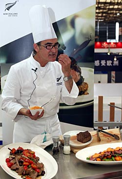 | 近日在上海舉行的中國國際食品飲料和酒店用品展上,來自23個國家和地區(qū)的800多家參展商展示了各類進口鮮果、罐頭食品、飲料等產(chǎn)品。圖為來自新西蘭的廚師在向觀眾展示新西蘭美食。本報記者