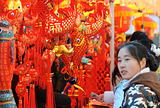 市民在南京夫子廟年貨大街選購民間工藝飾品。本報記者 孫參 攝 |
