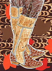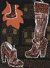 ROCKOCÒ品牌男鞋則使用奢華的18世紀(jì)裝飾,帶有一點(diǎn)諷刺的搖滾味道?臻g設(shè)計(jì)大多在腳踝以上,是18世紀(jì)的及踝休閑鞋以及牛仔靴樣式。用料以小牛皮為主,印有巴洛克式風(fēng)格的設(shè)計(jì)圖案,浮雕式的灰泥效果以及壓紋蛇皮。 |