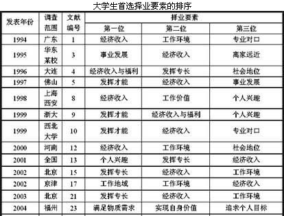 為了能夠比較準(zhǔn)確回答上述問(wèn)題,揭示當(dāng)代大學(xué)生的擇業(yè)觀,我們采用文獻(xiàn)分析的方法,在中國(guó)期刊全文數(shù)據(jù)庫(kù)中以大學(xué)生擇業(yè)觀調(diào)查為主題搜尋1980年至今公開(kāi)發(fā)表的有關(guān)大學(xué)生擇業(yè)觀的調(diào)查報(bào)告,查得69篇文獻(xiàn)。通過(guò)進(jìn)一步調(diào)查篩選,查找具有同質(zhì)性、可比較性的文獻(xiàn),最終確定24篇作為研究樣本。在文獻(xiàn)搜尋中發(fā)現(xiàn),上世紀(jì)80年代初到90年代初的這方面調(diào)查報(bào)告很少。1994年之后這方面的調(diào)查多了起來(lái),所以選取的報(bào)告主要從1994年開(kāi)始。這24篇文獻(xiàn)調(diào)查的地域廣泛,涉及京、滬、粵、浙、豫、皖等地;學(xué)科齊全,設(shè)計(jì)文、理、農(nóng)、醫(yī)、工等學(xué)科;樣本數(shù)量大,發(fā)放問(wèn)卷的數(shù)量近5萬(wàn),回收率平均在85%以上,調(diào)查結(jié)果具有比較好的可信度和代表性。 這些調(diào)查報(bào)告向我們揭示了大學(xué)生擇業(yè)的基本傾向,以下是對(duì)各報(bào)告主要調(diào)查結(jié)果的匯總: 從以上表格中我們可以看出,上世紀(jì)90年代以來(lái)大學(xué)生的擇業(yè)觀念相對(duì)穩(wěn)定,比較一致,大學(xué)生所在地域、學(xué)校、所學(xué)專業(yè)及性別等對(duì)大學(xué)生擇業(yè)觀的影響并不顯著。大學(xué)生們選擇職業(yè)時(shí)優(yōu)先考慮的因素主要有兩大類,物質(zhì)因素首當(dāng)其沖,如經(jīng)濟(jì)收入、物質(zhì)待遇、工資福利、報(bào)酬、工作環(huán)境,甚至離家的遠(yuǎn)近等;第二類因素為個(gè)人職業(yè)發(fā)展因素,如個(gè)人興趣、專長(zhǎng)的發(fā)揮、自我價(jià)值的實(shí)現(xiàn)、工作發(fā)展前景、單位前景、晉升機(jī)會(huì)、發(fā)展機(jī)會(huì)、社會(huì)地位等。