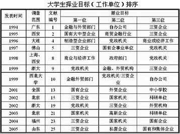 與此相一致,能夠滿足以上要素的工作單位和地域就成為大學(xué)生的最愛(ài):大型國(guó)企、特別是壟斷行業(yè)的國(guó)有企業(yè)、外企、政府機(jī)關(guān)、事業(yè)單位,這些單位因收入高、地位高而被大學(xué)生情有獨(dú)鐘;沿海城市、省會(huì)城市、直轄市機(jī)會(huì)多、空間大、經(jīng)濟(jì)條件好而被各地大學(xué)生一廂情愿地?zé)釕佟?