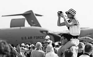 圖為8月25日在航空航天展覽會上,一名參觀者拍攝美軍飛機。新華社記者 沈伯韓