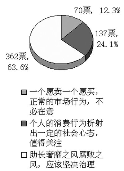 本報(bào)北京9月24日電 中秋前夕,高價(jià)月餅再次引起關(guān)注。9月17日,本報(bào)與人民網(wǎng)聯(lián)合推出“我們拿什么管住高價(jià)月餅”的網(wǎng)友調(diào)查,一周來(lái)反響熱烈。截至9月24日零時(shí),共有8990人次的網(wǎng)友參與調(diào)查(見(jiàn)圖)。對(duì)于治理高價(jià)月餅,多數(shù)被調(diào)查者態(tài)度一致,63.6%的人表示,高價(jià)月餅助長(zhǎng)奢靡腐敗之風(fēng),應(yīng)該堅(jiān)決治理。 調(diào)查顯示,在人們的實(shí)際生活中,月餅的禮品意義已經(jīng)遠(yuǎn)遠(yuǎn)大于食品意義。對(duì)于月餅的實(shí)際屬性,61.8%的人認(rèn)為現(xiàn)在月餅更接近于禮品,25.3%的人認(rèn)為月餅是“食品、禮品兼而有之”,僅有12.8%的人認(rèn)為月餅就是食品。在月餅的來(lái)源和使用去向兩項(xiàng)調(diào)查中,有44.6%的人表示,自家月餅以“別人送”和“單位發(fā)”為主,41.3%的人稱自己購(gòu)買月餅主要是為了“饋贈(zèng)親友”和“公務(wù)往來(lái)”。 值得注意的是,在“公務(wù)往來(lái)您選擇什么樣的月餅”的問(wèn)題中,有高達(dá)77.4%的被調(diào)查者表示將選擇包裝精美、很顯檔次的盒裝月餅,并認(rèn)為“價(jià)格高點(diǎn)無(wú)所謂”。 讓人擔(dān)憂的是,在“怎么看待高價(jià)月餅的出現(xiàn)”的調(diào)查中,有12.3%的被調(diào)查者認(rèn)為高價(jià)月餅的出現(xiàn)是“一個(gè)愿賣一個(gè)愿買,正常的市場(chǎng)行為,不必在意”。