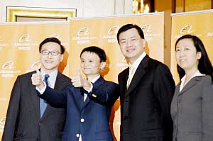 | 阿里巴巴首場路演儀式。從左至右:阿里巴巴集團CFO蔡崇信,阿里巴巴集團董事局主席馬云,阿里巴巴集團執(zhí)行副總裁、B2B(電子商務)總裁衛(wèi)哲、B2B公司CFO武衛(wèi)。本報記者