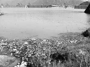 | 圖為湖北宜昌三峽大壩上游壩前庫區(qū)水面上漂浮的垃圾。劉君鳳