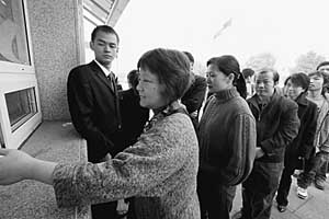 “上午3500,下午1500”,記者看到,在博物館門(mén)前發(fā)票處的窗口上,醒目地貼著每日參觀票的發(fā)放限額。當(dāng)日下午兩點(diǎn)半左右,博物館“下半場(chǎng)”開(kāi)始,參觀者排著整齊的隊(duì)伍有序進(jìn)場(chǎng),當(dāng)門(mén)前還有三四十人時(shí),發(fā)票暫停。保安解釋說(shuō):“3點(diǎn)鐘再發(fā),控制一下人數(shù)。”排隊(duì)的人們都心平氣和地等著,或翻看報(bào)紙,或三五成群地聊天。