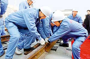 一般來說,23攝氏度是鋼軌鎖定的最佳溫度,可是工程恰好趕在了寒冬!皻鉁氐蛯(duì)我們鋼軌鎖定技術(shù)提出了非常大的挑戰(zhàn),”中鐵二局股份公司副總經(jīng)理、京津城際項(xiàng)目部經(jīng)理王云波說,“我們?nèi)藶榘?500米的鋼軌拉伸了七八十厘米,再扣緊鎖定,由此保證了鋼軌一年四季的安全性。這在全世界都是絕無僅有的!