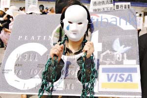 2007年6月,一名女子在中國(guó)臺(tái)北街頭將頭和戴著枷鎖的手放在信用卡模型中,告誡人們警惕信用卡依賴癥。 | 本報(bào)綜合報(bào)道