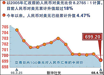 再從外因看,美元加速貶值,也推動(dòng)了人民幣匯率較快升值。受次貸危機(jī)等因素影響,國際金融市場上美元不斷走貶。今年一季度,美元對(duì)日元最多時(shí)貶值13.3%,對(duì)歐元最多時(shí)貶值7.5%。由于人民幣匯率參考一籃子貨幣進(jìn)行調(diào)節(jié),在一籃子貨幣中,大頭還是美元。美元持續(xù)貶值,人民幣就會(huì)不斷升值。