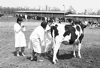 畜牧獸醫(yī)是一群扎根農(nóng)村,服務(wù)農(nóng)民的鄉(xiāng)士實用人才。在新農(nóng)村建設(shè)與扶農(nóng)、富農(nóng)過程中,他們承擔(dān)著重要的歷史使命。圖為一所畜牧獸醫(yī)職業(yè)院校的學(xué)生在山東濰坊畜牧科技示范園的奶牛養(yǎng)殖場頂崗實習(xí),熟練掌握從飼料配制、奶牛養(yǎng)殖與病疫防治,到奶制品加工等整條產(chǎn)業(yè)鏈的運作情況。王洪濤