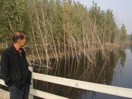 | 王建斌看著被污水泡死的樹木,黯然神傷。本報記者 李新民