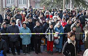 在北京某大學(xué)一考點(diǎn)外,許多家長在寒風(fēng)中等待參加全國英語等級考試(PETS)的孩子。在此參加考試的考生絕大多數(shù)是中小學(xué)生。本報(bào)記者 羅偉