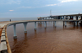 寧波港是我國(guó)國(guó)際集裝箱運(yùn)輸?shù)母删港,又是上海國(guó)際航運(yùn)中心的重要一員。根據(jù)國(guó)家規(guī)劃,上海國(guó)際航運(yùn)中心由洋山港與長(zhǎng)江沿岸港口和寧波港三者組成,功能互補(bǔ),是上海國(guó)際航運(yùn)中心的“中心兩翼”。然而由于杭州灣的阻隔,寧波港與上海港、太倉(cāng)港交通不便,不利于三港優(yōu)勢(shì)疊加和功能互補(bǔ)。 大橋建成后,杭州灣南岸的寧波、紹興和臺(tái)州等地到上海港、洋山港的距離均有不同程度縮短。寧波市港口局副局長(zhǎng)孫時(shí)光表示,杭州灣跨海大橋的貫通,對(duì)寧波港口來(lái)講,既是機(jī)遇也是挑戰(zhàn)。孫時(shí)光認(rèn)為,從長(zhǎng)遠(yuǎn)看,寧波港和上海港優(yōu)勢(shì)互補(bǔ)各呈所長(zhǎng),F(xiàn)寧波港有80多條國(guó)際航線,上海港有120多條國(guó)際航線。杭州灣大橋的貫通,環(huán)杭州灣及周邊地區(qū)的出口企業(yè),也有了更多的國(guó)際航線和更便捷運(yùn)輸路線的選擇余地。 據(jù)介紹,以往溫州、臺(tái)州一帶到上海的貨物,基本通過(guò)杭州線路運(yùn)達(dá)。杭州灣大橋建成后,每標(biāo)箱經(jīng)由杭州灣大橋要比走滬杭高速節(jié)省運(yùn)費(fèi)1500元左右。另一方面,蘇南和浙北地區(qū)的貨物流向也可能發(fā)生變化。杭州灣大橋建成后,蘇南到寧波北侖港的運(yùn)輸距離也相應(yīng)縮短了120公里,使這些地區(qū)的貨物進(jìn)出口增加了一個(gè)與上海港相類似的口岸。 而與大上海隔海相望的寧波港與舟山港,通過(guò)杭州灣跨海大橋與上海的蘆潮港相通,再通過(guò)上海東海大橋與大小洋山港相連,串起了中國(guó)長(zhǎng)江出?诮_B運(yùn)“T”字型的黃金海岸。有數(shù)據(jù)顯示,2006年,上海港實(shí)現(xiàn)吞吐量4.7億噸、集裝箱2171萬(wàn)標(biāo)箱;寧波-舟山港總吞吐量4.2億噸、集裝箱712萬(wàn)標(biāo)箱。從港口吞吐量規(guī)模而言,上海港、寧波-舟山港已分別位居全球第一和第三的位置。據(jù)介紹,現(xiàn)舟山港-寧波港-杭州灣跨海大橋-蘆潮港-東海大橋-大小洋山港,已成為中國(guó)乃至世界上最大的港口群。而杭州灣跨海大橋則處在一線牽?jī)砂兜年P(guān)鍵環(huán)節(jié)。