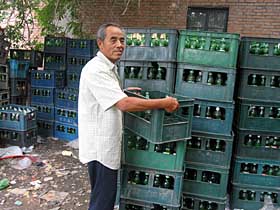 | 在天津市西青區(qū)的“世斌酒水批發(fā)部”,一位搬運瓶箱的老人站在華潤啤酒的瓶箱前,左后是豪門千杯啤酒的瓶箱。 |