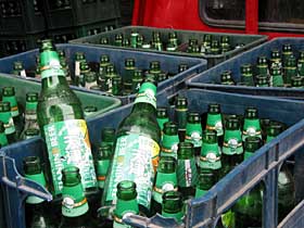 6月24日下午,記者來到天津市西青區(qū)南河鎮(zhèn)牛坨子村的一個小賣部,女店主?∑秸f,她干零售店有10年了,這些年一直賣豪門的“千杯”啤酒,華潤“清爽”不太好賣,于是這兩三年干脆就不賣了。6月15日,華潤的業(yè)務員開著貨車來找她,說“清爽”要打入這個地區(qū),今后這個村都得賣這個,“我用八箱“清爽”換你六箱“千杯”,旁邊的店都換了,我們領(lǐng)導說了,一天打一個村,你今天必須換”。 牛俊平說,她跟華潤業(yè)務員討價還價,最終以十箱華潤“清爽”換了六箱豪門“千杯”。當時她還感覺挺合適,因為以少換多,這兩種啤酒的零售價又一樣,是1.5元/瓶?赊D(zhuǎn)天就后悔了,因為好多顧客習慣了“千杯”的口味,一看沒有“千杯”扭頭就走,反倒影響她的業(yè)務了。她不得不又去批發(fā)地進了七八箱“千杯”。 像?∑竭@樣,被華潤換了酒的小商戶還很多,而換酒后產(chǎn)生的影響波及到她們進貨的二級批發(fā)商。 天津市西青區(qū)“世斌酒水批發(fā)部”是當?shù)叵蛄闶鄣?點)批發(fā)酒水的二級批發(fā)商,最近,經(jīng)理周世斌和他愛人為豪門“千杯”啤酒瓶箱的周轉(zhuǎn)問題急得直撓頭。周世斌說,這幾年啤酒瓶和塑料箱都是各品牌專用,瓶箱的周轉(zhuǎn)流程是這樣的:零售店(點)→二級批發(fā)商→一級批發(fā)商→啤酒制造商。賣哪個牌子的酒要回來哪個牌子的瓶箱,這樣才能保證從一級批發(fā)商再次進貨。他介紹說,他的零售點基本都是賣“千杯”的,過去賣多少酒基本能回收多少瓶箱?6月中旬以來,各零售點差不多都讓華潤用“清爽”換了“千杯”,換走的酒不知去向,結(jié)果收回來的瓶箱都成了華潤的。 在后院,記者看到了一大堆華潤的瓶箱,周世斌說,他沒賣過華潤的酒,現(xiàn)在回來一大堆華潤的瓶箱,現(xiàn)在零售點每天還要大量進豪門“千杯”,他已經(jīng)沒有足夠的瓶箱去一級批發(fā)商那里換酒了。過去他一天進一次“千杯”,現(xiàn)在瓶箱周轉(zhuǎn)出現(xiàn)困難,不得不一天進兩次貨,不僅影響他的正常銷售,一級批發(fā)商也有意見,說增加了他們的運輸成本。 他還翻出一厚疊押金條說:“我在豪門公司交押金進了400多套瓶箱,最近只剩下了五六十套了。如果以后豪門的瓶箱還回不來,這些押金就打水漂了! 一級酒水批發(fā)商天津市西青區(qū)張窩鎮(zhèn)“茂盛副食酒水批發(fā)部”經(jīng)理胡衛(wèi)標說:“我干了十幾年的酒水批發(fā),賠錢換人家的酒,這樣的事我從來沒見過!
