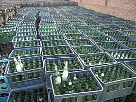 | 在天津市北辰區(qū)漢溝鎮(zhèn)華潤雪花啤酒天津公司附近的化輕公司倉庫角落,記者看到兩大垛單獨碼放的豪門啤酒瓶箱,箱里都裝著嶄新的千杯啤酒空瓶。本報記者
