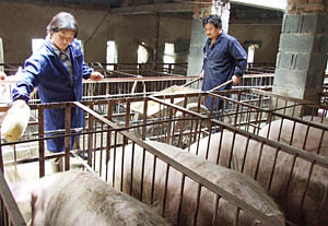 | 8月15日,安徽省淮北市烈山區(qū)古饒鎮(zhèn)一家養(yǎng)豬場的養(yǎng)殖戶正在給育肥豬喂食。為提高養(yǎng)殖戶的積極性,盡快保證生豬市場供應(yīng),國家財政從2007年起,實施能繁母豬補貼政策,按每頭50元的補貼標準,對飼養(yǎng)能繁母豬的養(yǎng)殖戶(場)給予補貼。本報資料照片 | 肉價飆升并未調(diào)動養(yǎng)殖熱情