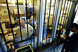 | 一名男子(右)在法國巴黎一家貨幣兌換處換錢。本報資料照片 | 美國將因金融監(jiān)管疏漏遭批