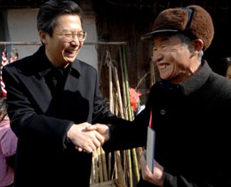 1月1日,75歲的老人何沛昌(左)由于身體不好,無(wú)法到村里領(lǐng)養(yǎng)老金,浙江省余姚市委書(shū)記王永康(右)步行來(lái)到何家,把養(yǎng)老金存折交到了何沛昌手中。新華社記者:王小川