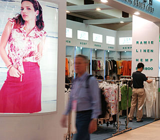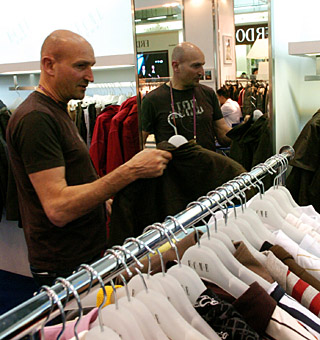 | 一位意大利采購商在一家紡織企業(yè)設(shè)在廣交會的展位前選購服裝。新華社記者