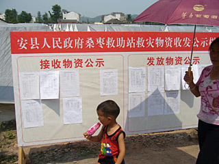 6月2日,都江堰市聚源鎮(zhèn)受災(zāi)群眾集中安置點(diǎn)。 這里與教學(xué)樓整體垮塌的聚源中學(xué)只有一河之隔。附近鎮(zhèn)上所有房屋成了危房或已坍塌的居民都臨時(shí)搬到這里。隔河望去,一排排藏青色的民政救災(zāi)帳篷整齊如軍營(yíng)。 正值中午時(shí)分,帳篷里的人多外出辦事了,守在帳篷內(nèi)的多是婦女和老人。一對(duì)年輕夫婦正推著嬰兒車準(zhǔn)備外出,一位上了歲數(shù)的大爺含一支煙袋,正外出遛鳥。帳篷中,人們的生活正以一種別樣的方式在繼續(xù)。 自阿壩州養(yǎng)路段退休的吳顯才與老伴袁桂華正在河邊的林蔭下休息,身旁還有孫子。他們都穿著企業(yè)捐贈(zèng)的短袖衫,手中各喝著一瓶農(nóng)夫山泉礦泉水。吳顯才說(shuō):“我們家的房子在鎮(zhèn)上街邊,120平方米的房子全塌了。屋里的東西搶出來(lái)一些,電視也不知壞沒(méi)壞! 盡管戶口不在這里,他們還是領(lǐng)到了瓶裝水和快餐面。一些外地來(lái)的志愿者還給分發(fā)了常備物資,如感冒藥、藿香正氣水、衣服等。說(shuō)著,他還指著自己穿的衣服說(shuō),上邊都標(biāo)有太極藿香液的字樣。據(jù)說(shuō),這家企業(yè)向?yàn)?zāi)區(qū)發(fā)放了10萬(wàn)件衣服,見(jiàn)人就發(fā)。 聚源鎮(zhèn)8大隊(duì)1小隊(duì)的村民楊中芳說(shuō),他是本地戶口,救災(zāi)物資只要來(lái)了,都有他們的份兒。家中發(fā)了夠10天吃的餅干,還有足夠喝的純凈水,20桶方便面。地震后的5天里,每天都會(huì)領(lǐng)到救災(zāi)用的食品和水,后來(lái)隔幾天發(fā)一次。 在聚源鎮(zhèn)集中安置點(diǎn),住在22號(hào)帳篷的李蓮剛泡了一包方便面,準(zhǔn)備吃午飯。她對(duì)記者說(shuō),他們現(xiàn)在3家人住在一個(gè)帳篷里,現(xiàn)在有幾千人住在這個(gè)安置點(diǎn)。記者看到,帳篷內(nèi)有成堆的救災(zāi)物資,有成箱的礦泉水、方便面、牛奶等。在靠近門口的一角,還堆著大米等成袋物資。李蓮說(shuō):“平時(shí)主要吃稀飯、餅干和方便面,也上街買菜,菜價(jià)與平時(shí)一個(gè)樣,只是魚價(jià)漲了。” 6月5日,在綿陽(yáng)市安縣睢水鎮(zhèn)幼兒園,正趕上鎮(zhèn)領(lǐng)導(dǎo)一班人在一個(gè)救災(zāi)帳篷內(nèi)研究工作。他們正在傳達(dá)一份“特急”文件,要求救災(zāi)物資的管理臺(tái)賬一定要建立起來(lái),各鄉(xiāng)鎮(zhèn)每個(gè)部門、村民委員會(huì)都要建立公示救災(zāi)物資發(fā)放制度,接受社會(huì)監(jiān)督。 對(duì)于救災(zāi)物資登記發(fā)放工作,睢水鎮(zhèn)黨委書記馮德強(qiáng)說(shuō):“最開始,特別是震后前幾天,物資來(lái)源復(fù)雜。我們更多是做好災(zāi)民的安置,讓受災(zāi)群眾有東西吃,有地方住,有水和藥品。由于人手少,物資管理有些亂! 馮德強(qiáng)說(shuō),但5月17日后,物資管理關(guān)口開始把嚴(yán)了,大宗物品均有村里簽字。救災(zāi)物資都是現(xiàn)場(chǎng)統(tǒng)一配給,鄉(xiāng)鎮(zhèn)直接到發(fā)放點(diǎn)領(lǐng)取,各個(gè)村從鄉(xiāng)里領(lǐng),小組再到村里領(lǐng)。其中,像帳篷、膠布、被子等容易清點(diǎn)的大宗物資把得很嚴(yán),但像方便面等一些不好清點(diǎn)的物資,百姓不可能等著你清理好再領(lǐng),所以具體數(shù)量上有些亂。 現(xiàn)在,全鎮(zhèn)6000來(lái)戶家庭,大概領(lǐng)到900多頂帳篷,都發(fā)放下去了,重點(diǎn)是解決山上受災(zāi)最重的群眾。目前,帳篷缺口在1000頂左右。 6月5日,記者來(lái)到安縣桑棗救助站,這里臨時(shí)居住著2000多名受災(zāi)群眾。來(lái)自安縣茶坪鄉(xiāng)的劉剛說(shuō),他們一個(gè)帳篷內(nèi)住了3家14個(gè)人,平時(shí)吃免費(fèi)食堂,一般兩個(gè)素菜,偶爾還有肉吃,大米管夠。 民政部6月1日頒布了《汶川地震抗震救災(zāi)生活類物資分配辦法》,規(guī)定物資發(fā)放點(diǎn)要吸收受災(zāi)群眾推選的代表參與生活類物資的發(fā)放和管理工作,實(shí)行收發(fā)“實(shí)名制”。記者看到,在桑棗救助站內(nèi),已設(shè)有專門的接收發(fā)放救災(zāi)物資公示欄,上面清楚地登記著有受災(zāi)群眾簽字的領(lǐng)取物資明細(xì)。