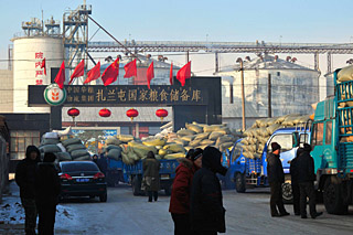 | 2月3日,滿載糧食的車輛在內(nèi)蒙古扎蘭屯國家糧食儲(chǔ)備庫門口排起長隊(duì)。新華社發(fā)(王澤蔚