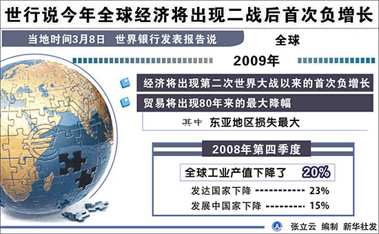 美國時間3月8日(北京時間3月9日),世界銀行發(fā)布報告稱,2009年全球經濟將出現(xiàn)二戰(zhàn)后首次負增長,全球貿易將創(chuàng)出80年來的最大降幅,發(fā)展中國家也將面臨2700到7000億美元的融資缺口。為此,世行敦促20國集團向發(fā)展中國家提供幫助以滿足其外部融資需求。 周六(3月14日),20國集團財長和央行行長會議將在英國倫敦召開。在為此次會議準備的一份名為《逆流而上:發(fā)展中國家如何應對全球危機》的報告中,世界銀行作出了上述判斷。