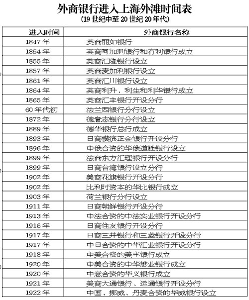 高樓大廈林立的上海外灘,是鴉片戰(zhàn)爭以來外資進入的一個縮影,在這塊彈丸之地上幾乎集中了上海所有的外資銀行,故而當時將外資銀行稱作“外灘銀行”。 外資銀行很早就進入了上海,與此相比,華資銀行的產生則整整晚了半個世紀。鴉片戰(zhàn)爭后,依據不平等的《中英南京條約》,上海等五個東南沿海城市被辟為通商口岸。上海開埠后的第四年即1847年,英商麗如銀行率先搶灘上海。在隨后的70多年中,以英國資本為主導,包括法國、德國、日本、俄國、美國等國資本在內的30余家銀行陸續(xù)在上海登陸(詳見外商銀行進入上海外灘時間表)。 這些銀行主要集中在從延安東路外灘到北京東路外灘,形成了上海的金融中心。各銀行為了顯示資本的雄厚,都在建筑外觀上追求各自獨特的風格,有哥特式、巴洛克式、羅馬式、中西合璧式等等。 由于外灘附近匯集了各國頗具實力的銀行,比如英國匯豐銀行、德國德華銀行、美國華旗銀行等,使外灘成為名副其實的“東方華爾街”。