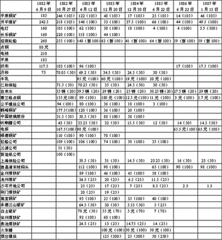 1840年后,西方新型股份制企業(yè)的組織方式,隨著鴉片戰(zhàn)爭(zhēng)后的資本主義勢(shì)力進(jìn)入了中國(guó),對(duì)中國(guó)近代新式工商企業(yè)的創(chuàng)辦,產(chǎn)生了相當(dāng)大的刺激和借鑒作用。1872年,上海誕生了首家采用股份制方式成立的近代企業(yè)——輪船招商局。輪船招商局的誕生,表明這種西方式的企業(yè)組織方式已開始被中國(guó)人認(rèn)識(shí)和接受。隨后不到十年,采用這種新型股份制方式組織成立的中國(guó)近代企業(yè),已從輪船招商局一家增至30多家。這種現(xiàn)象,正如1882年6月13日《申報(bào)》的評(píng)論文章所說:“自招商局開之于先,召集商股創(chuàng)成大業(yè),各商人亦踴躍爭(zhēng)先,競(jìng)投股分,自是而后,百?gòu)U具興”,“至今日而開平煤礦、平泉銅礦、濟(jì)和保險(xiǎn)、機(jī)器織布、與夫紙作牛乳、長(zhǎng)樂之銅礦、津滬之電線、點(diǎn)銅礦,無不競(jìng)為舉辦,蒸蒸然有日上之勢(shì)”。這些“蒸蒸然有日上之勢(shì)”的新式工商企業(yè),無論廠址在那里,無一例外均以上海為中心募集資金和買賣股票,從而引發(fā)和掀起了上海買賣股票的第一次高潮。附表是對(duì)這次股票買賣高潮概況的一個(gè)反映。 附表編排的是1882至1887年六年左右的時(shí)間中,《申報(bào)》上刊載的上海證券市場(chǎng)上新式企業(yè)股票價(jià)格的幾個(gè)代表性時(shí)間數(shù)字。需要說明的是,表中第一欄即1882年6月9日的股票價(jià)格,是《申報(bào)》這一上海也是中國(guó)當(dāng)時(shí)最主要的中文報(bào)紙刊載中國(guó)新式工礦企業(yè)股票價(jià)格之始。而最后一欄即1887年1月13日的數(shù)字,則是《申報(bào)》這一時(shí)期刊載股票價(jià)格的最后一次!渡陥(bào)》之所以能在1882年6月9日開始刊載中國(guó)企業(yè)的股票市場(chǎng)價(jià)格,這本身就證明股票的交易和市場(chǎng)此前不僅在上海已經(jīng)形成,而且已具有了一定的規(guī)模