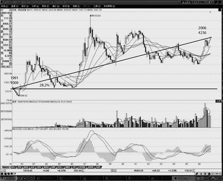 000個。上海證券交易所正在向世界一流的證券交易所邁進。到2006年9月21日止:共有上市公司836家;上市證券1109只;上市股票880只;總股本7316億股;總流通股本2025億股;總市值4萬多億元;總流通市值11396億元。 1990年12月1日,深圳證券交易所成立。它也是不以贏利為目的,實行會員制的事業(yè)法人。它的領(lǐng)導體制與上海證券交易所相同,是由會員大會、理事會、總經(jīng)理三個環(huán)節(jié)組成。組織公平的集中競價交易,即時公布交易行情,辦理股票和公司債券的上市、暫停上市、恢復上市或終止上市事務(wù),對證券交易實行實時監(jiān)控,對上市公司的信息披露進行監(jiān)督等。深交所的發(fā)展目標是用15~20年的時間,進入國際主要證券市場行列,成為國際知名的證券市場。到2006年9月21日止:共有上市公司545家;上市證券727只;總市值13093億元;總流通市值6281億元。 二地股票市值達到了6萬多億人民幣。 同樣,中國的股市也給了投資者很高的回報率,遠遠大于同期銀行存款的回報。投資股市的風險遠遠小於存于銀行的風險,投資風險同樣是零。 圖4反映了深成指從1991年到2006年15年的實際走勢。股指從1991年的1000點升到了2006年10月28號的4236點。凡是在深圳股票市場的投資者在1991年投入1000元,在2006年將有4236元的投資收益。每年的復利投資收益率是9.9%。如果考慮15年的通貨膨脹率是3.5%。投資者的實際收益率為每年的6.4%。 同期投資者在銀行的存款收益率只有3%,如果扣除物價的通貨膨脹率是3.5%。每年銀行的投資收益率就變成了-0.5%。實際上投資者在銀行的投資出現(xiàn)了風險和虧損。