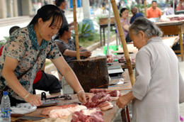 地震災區(qū)農(nóng)貿(mào)市場供應充足。圖為5月27日,四川平武縣一位老人在農(nóng)貿(mào)市場買肉。新華社記者:黃深鋼 攝