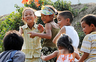 | 6月5日,幾名映秀心連心學(xué)校的學(xué)生在放學(xué)路上嬉戲。目前,學(xué)校一共有學(xué)生17名,包括從幼兒園、小學(xué)到初中各年齡段的孩子。他們?cè)谶@里除了正常學(xué)習(xí)外,更多的是接受心理輔導(dǎo),以幫助他們樹立信心,走出災(zāi)難的陰影。新華社記者